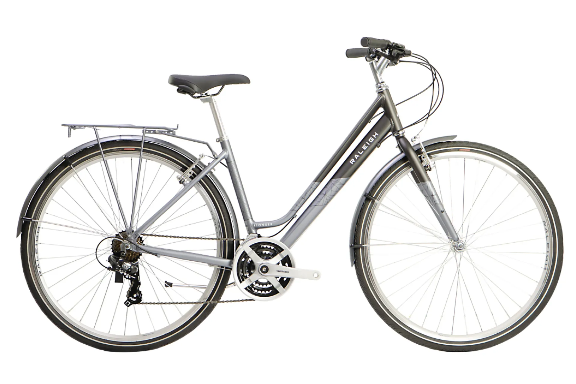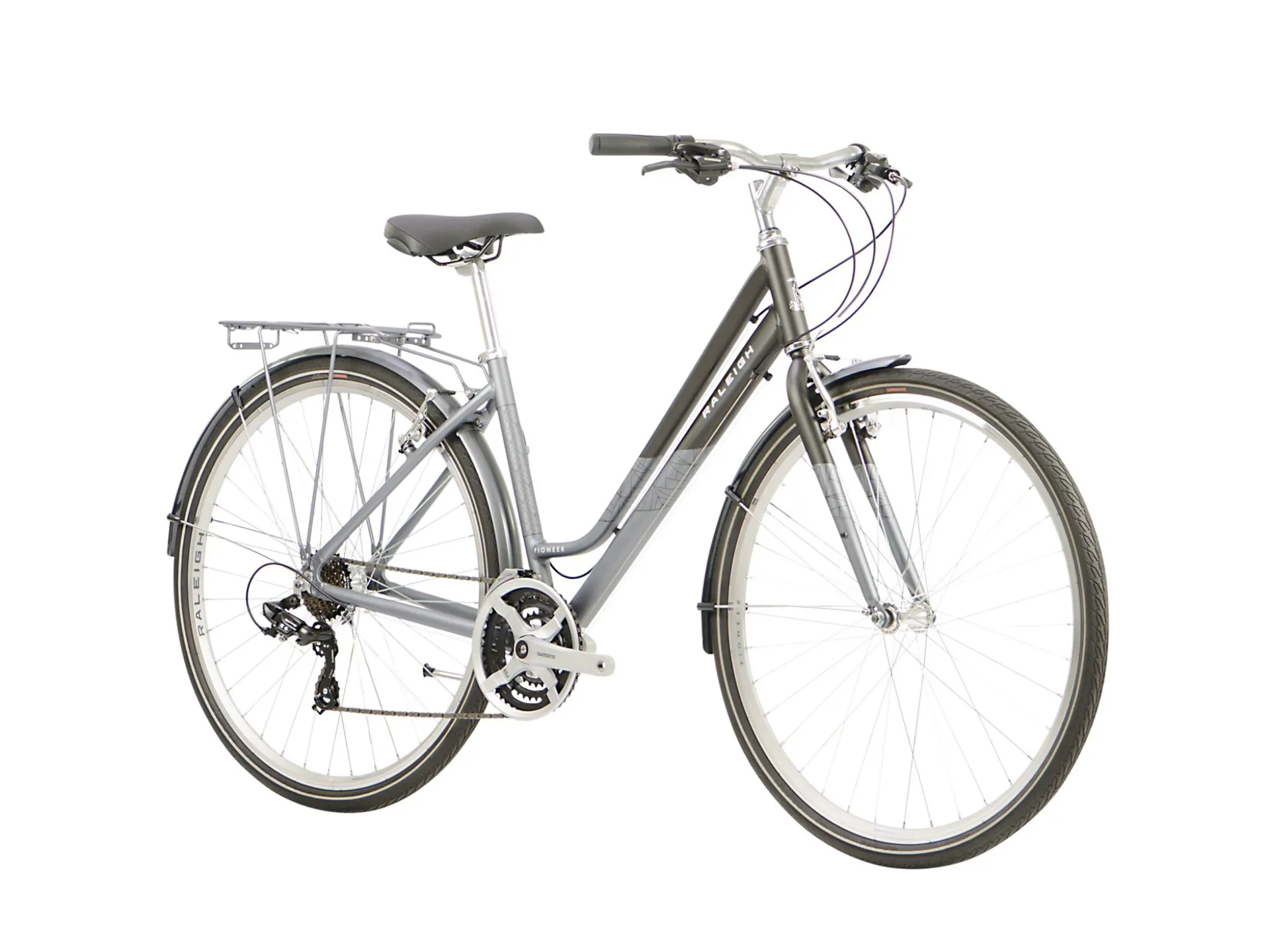 The Raleigh Pioneer features a lightweight, strong 6061 aluminium frame, in stylish grey and silver. A 21 speed Shimano drivetrain provides smooth shifting over a wide range of gears, taking on busy roads, hills and slopes.
